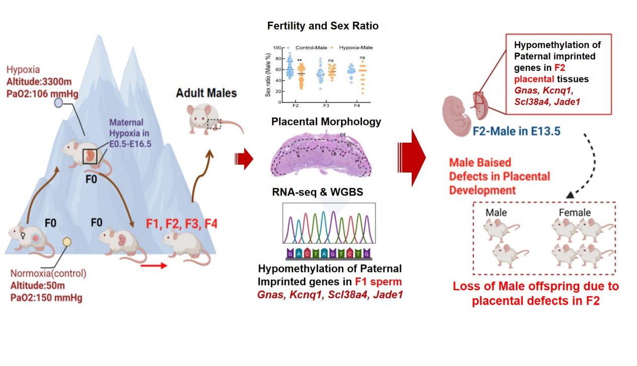 為探究母體低氧環(huán)境暴露對子代的跨代影響,中國科學(xué)院西北高原生物研究所動(dòng)物生態(tài)與資源保護(hù)研究團(tuán)隊(duì)建立了孕期低氧暴露小鼠模型,將經(jīng)歷過孕期低氧暴露的小鼠(F0)轉(zhuǎn)運(yùn)至低海拔后,出生的雄性小鼠和對照雌鼠合籠,連續(xù)飼養(yǎng)四代(F1-F4)。從2018年 9月到 2023年 8月,通過大量出生性別統(tǒng)計(jì)和不同發(fā)育階段的性別鑒定,發(fā)現(xiàn)母體孕期低氧暴露會造成F2代雄性個(gè)體顯著減少。進(jìn)一步的分析發(fā)現(xiàn)F2雄性減少是由于在胚胎期13.5天發(fā)生的胚胎特異性丟失。雄性胚胎丟失的主要原因?yàn)樘ケP形態(tài)和功能異常。研究團(tuán)隊(duì)通過胎盤轉(zhuǎn)錄組和全基因組DNA甲基化測序聯(lián)合分析,發(fā)現(xiàn)父源印記基因Slc38a4,Gnas,Jade1 和Kcnq1表達(dá)異常。隨后,通過對F1代小鼠成熟精子與F2代雄性胎盤全基因組DNA甲基化進(jìn)行聯(lián)合分析,結(jié)果發(fā)現(xiàn)以上印記基因DNA甲基化模式高度相似。這說明經(jīng)歷胚胎期低氧的F1代雄性小鼠的精子存在甲基化異常,并且可以進(jìn)一步影響F2雄性個(gè)體生長發(fā)育進(jìn)而導(dǎo)致性別比例異常。該工作系統(tǒng)地揭示母體低氧暴露對F1及F2代發(fā)育影響的跨代遺傳機(jī)制,為深入理解高原低氧暴露的生殖和健康風(fēng)險(xiǎn)提供了新的表型數(shù)據(jù)。