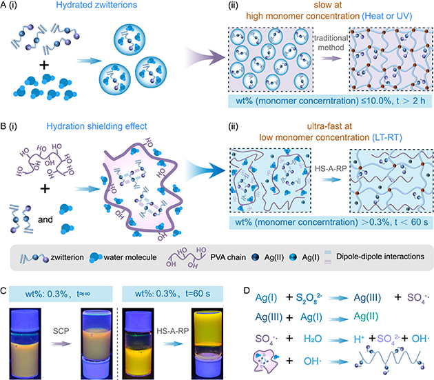 近日,中國(guó)科學(xué)院蘭州化學(xué)物理研究所潤(rùn)滑材料全國(guó)重點(diǎn)實(shí)驗(yàn)室材料表面與界面研究組周峰研究員團(tuán)隊(duì)提出了基于一種基于“水合屏蔽”效應(yīng)的聚兩性離子水凝膠制備新方法——HS-A-RP,創(chuàng)新地將PVA作為水合屏蔽劑引入Ag+-S2O82-氧化還原催化體系中,實(shí)現(xiàn)了通用性兩性離子單體在寬單體濃度范圍(質(zhì)量分?jǐn)?shù):0.3-50 wt%)、寬溫域(-5℃-37℃)內(nèi)的超快速聚合(t<60 秒),且反應(yīng)而無(wú)需外部能量(紫外光/熱)的輸入。