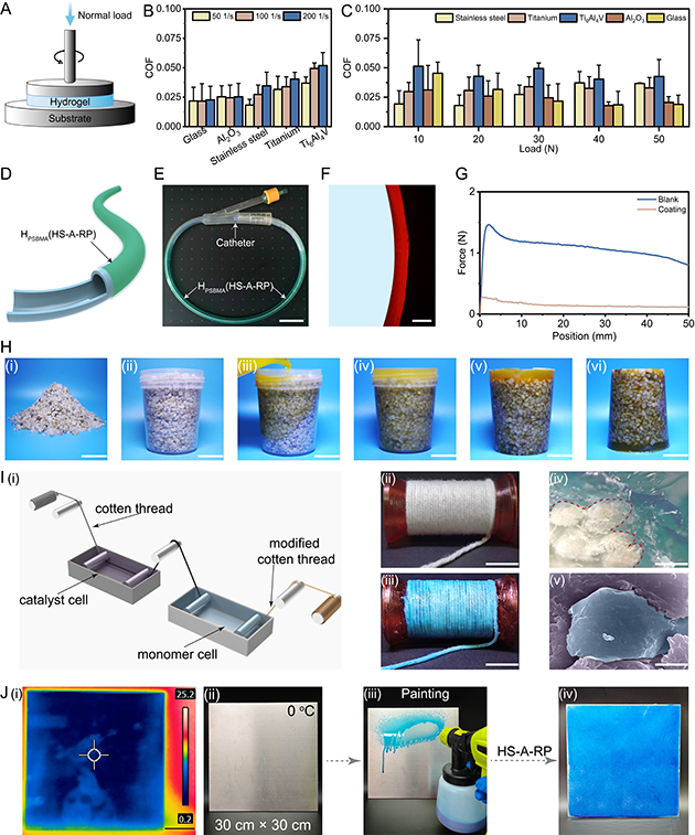 與傳統(tǒng)光/熱引發(fā)體系相比,HS-A-RP 制備的聚兩性離子水凝膠不僅具有更致密的網(wǎng)絡(luò)結(jié)構(gòu)和更好的機(jī)械性能,還展現(xiàn)出了優(yōu)異的抗溶脹、潤(rùn)滑、抗菌和防污性能。通過(guò)HS-A-RP方法制備的聚兩性離子水凝膠既能夠作為功能涂層有效改善生物醫(yī)用器械的表面潤(rùn)滑性,又能實(shí)現(xiàn)對(duì)熱敏材料和砂礫的原位封裝。此外,快速凝膠化和寬溫域內(nèi)可反應(yīng)的特性使HS-A-RP能夠在不同基底表面和極端穩(wěn)定環(huán)境條件下規(guī)?;苽渚蹆尚噪x子水凝膠涂層。該方法不僅為聚兩性離子水凝膠的化學(xué)合成提供了新途徑,還極大地拓展了其在生物醫(yī)療、工程裝備等領(lǐng)域應(yīng)用領(lǐng)域。